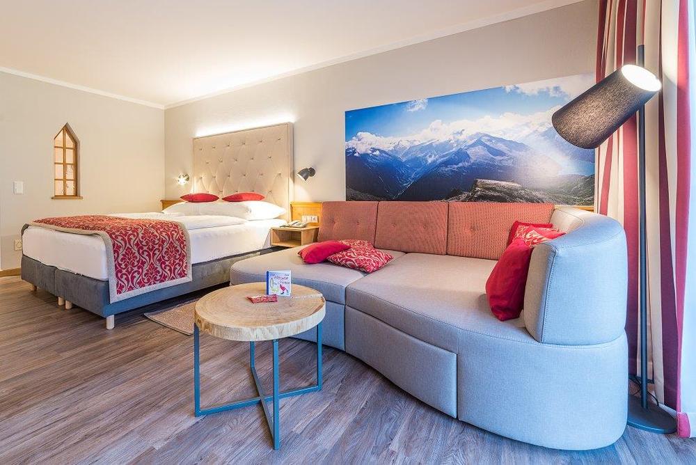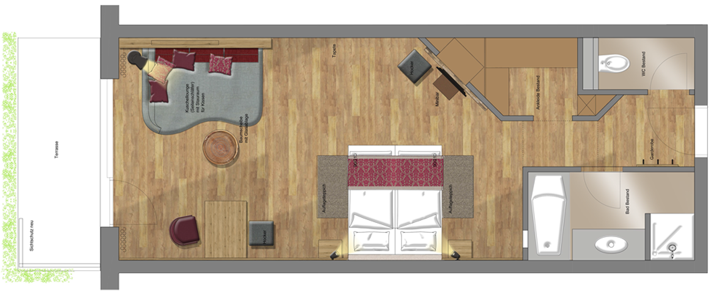 Light and friendly are the terms that come to mind for our Kuschelnest suite for 2 to 4 people. And measuring 38 to 42 m² it is certainly spacious as well. The bathroom is equipped with a bath and shower, the toilet is separate. Every suite has a balcony or a terrace. The practical wardrobe within the living area offers ample space. In addition to a mini safe and minibar, the Kuschelnest suite has a telephone, sat-tv, hairdryer and free Wi-Fi.